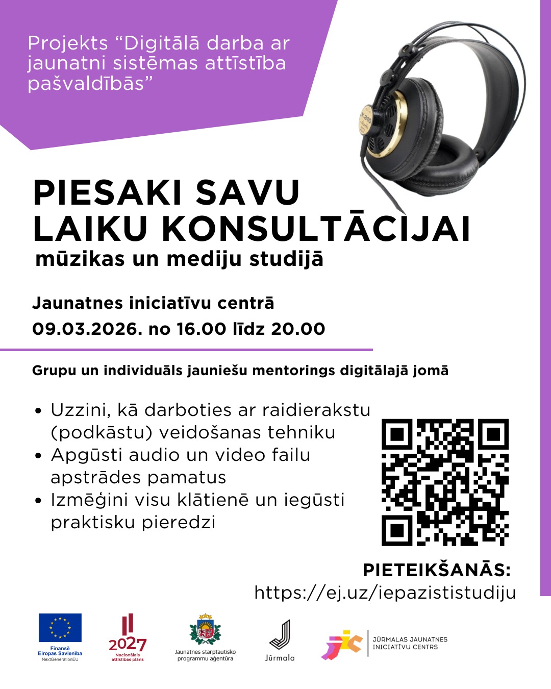 👉Piesaki savu laiku konsultācijai mūzikas un mediju studijā. Uzzini, kā izmantot labiekārtotās studijas tehniku – pieejamas iekārtas video filmēšanai, straumēšanai, audio ierakstīšanai, dīdžejmākslai un fotografēšanai. 📅 9. martā🕓 16.00–19.00📍 Jaunatnes... |