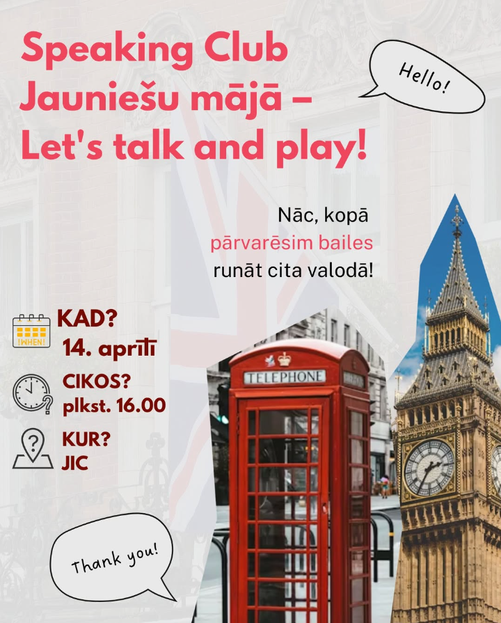 14.aprīlī plkst. 16.00 – Speaking Club Jauniešu mājā Let’s talk and play! Vēlies uzlabot savu angļu valodu jautrā, draudzīgā un nepiespiestā atmosfērā?Tad pievienojies Speaking Club! 🟢 Kopā spēlēsim valodu spēles,...