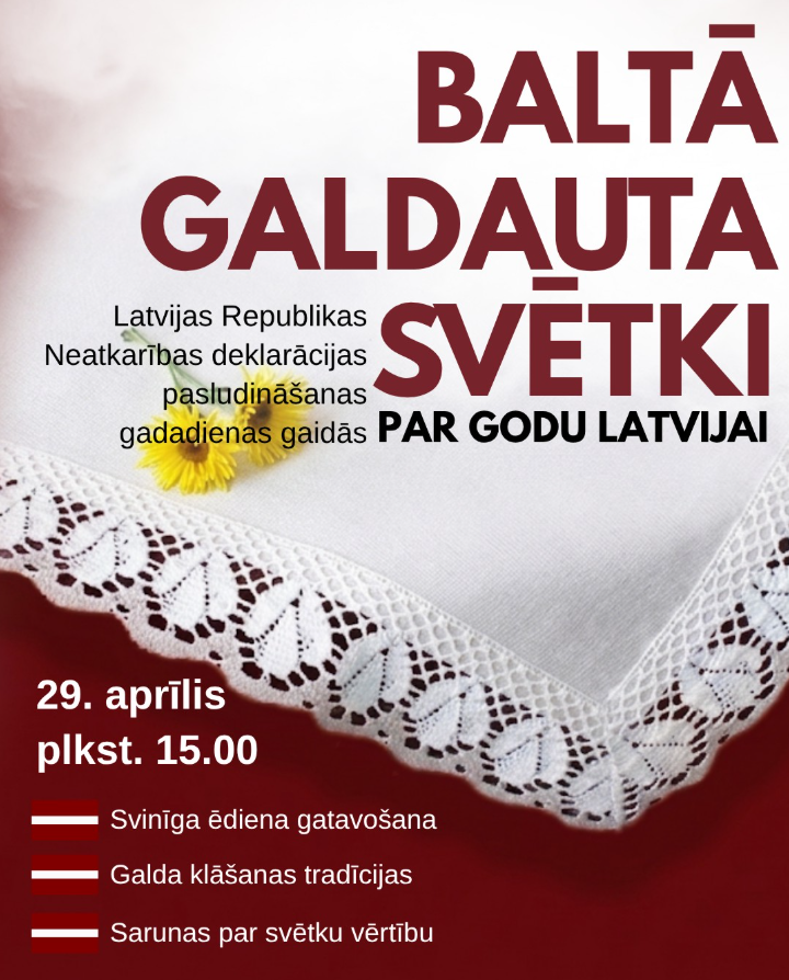 Aicinām jauniešus uz kopā būšanas svētkiem! ✨ 📅 29. aprīlī plkst. 15.00🍽️ Baltā galdauta svētki Latvijas Republikas Neatkarības deklarācijas pasludināšanas gadadienas gaidās aicinām sanākt kopā, lai īpašā gaisotnē svinētu un... |