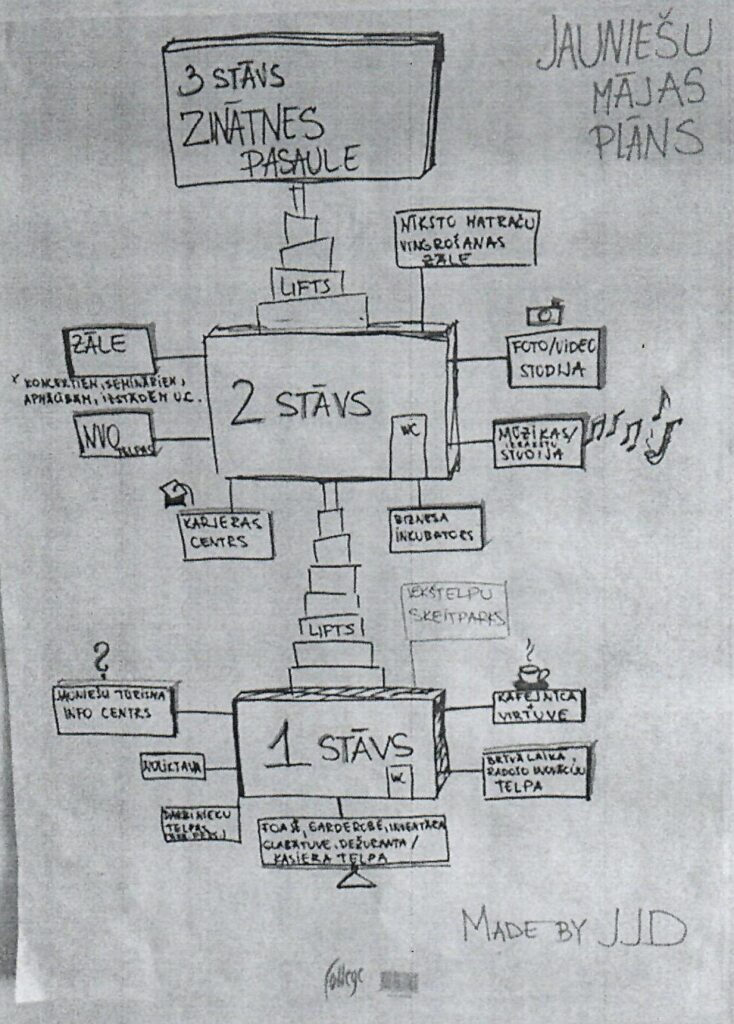 - Atrodoties skolas telpās jaunieši ātri vien saprata, ka viņu vietai jābūt neformālākai un tieši viņiem. Tika organizēta «Kafija ar politiķi» – tikšanās ar mēru, kurā tika pārrunāta jauniešu izstrādātā ideja par jauniešu māju 3 stāvos ar mūzikas studiju, foto studiju, virtuvi un citām telpām.